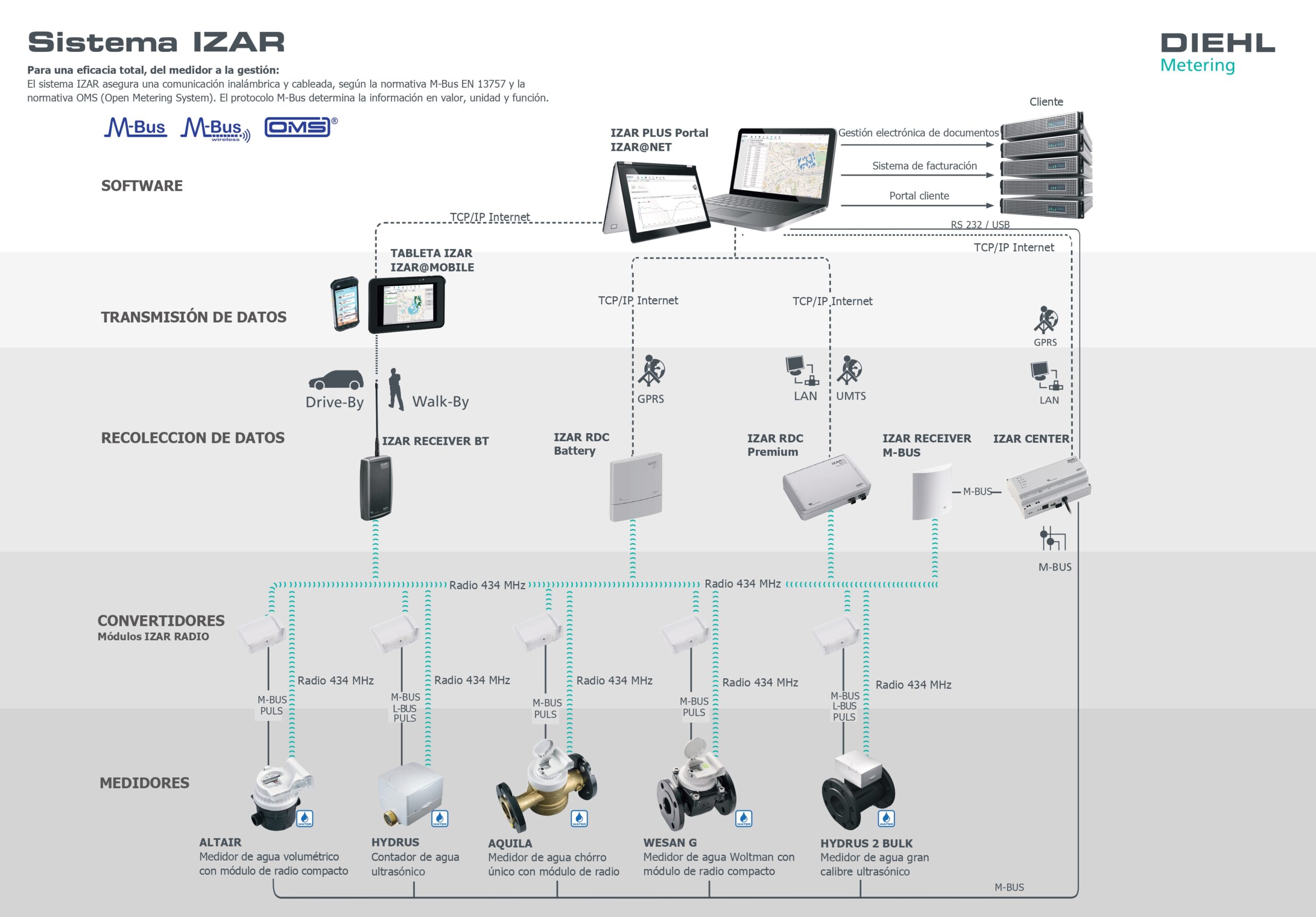 Está diseñado para la radiolectura móvil y la telelectura en red fija de largo alcance de medidores para agua Diehl Metering.